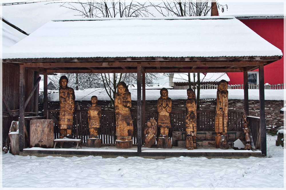 In curtea muzeului se regasesc sculpturi din lemn ce reprezinta viata Femeii de la tinerete pana la batranete.